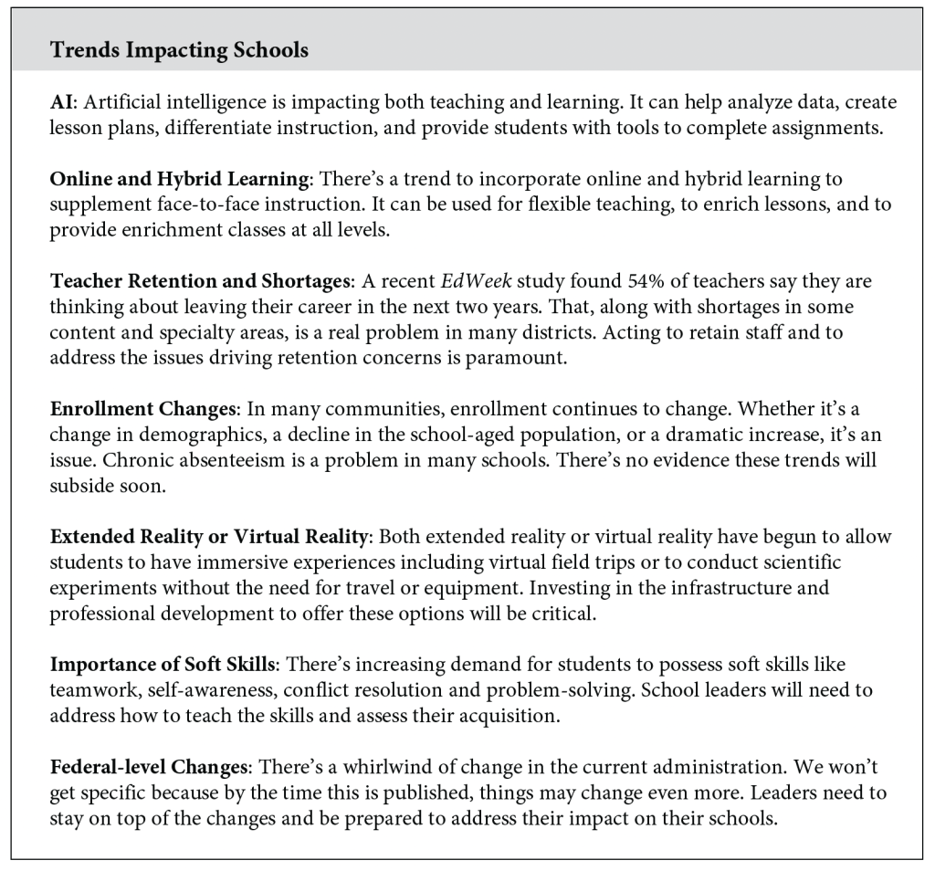 Marzano Research identified several trends that would shape K-12 education in 2025 (Scott, 2024). Some are predictable, like changes at the federal level and teacher retention. Others reflect the growing impact of technology on education—things like AI (artificial intelligence), online/hybrid learning and virtual reality.