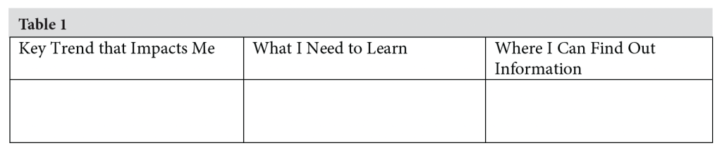 - Analyze your environment: Scan the environment in which your school exists—district, community, state, nation, and world. Consider the seven trends identified by Marzano Research. Identify issues that affect your school and those that affect the world more broadly. These trends and issues often emerge as important. What do you need to learn about these trends? Where can you gather that information?